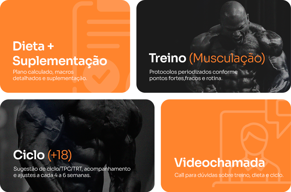 • 3 serviços com acompanhamento anual (Treino + Dieta + Ciclo)